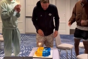 蛋糕惊喜+全队合唱!湖人众将为东契奇庆生 詹姆斯变身“领唱员”